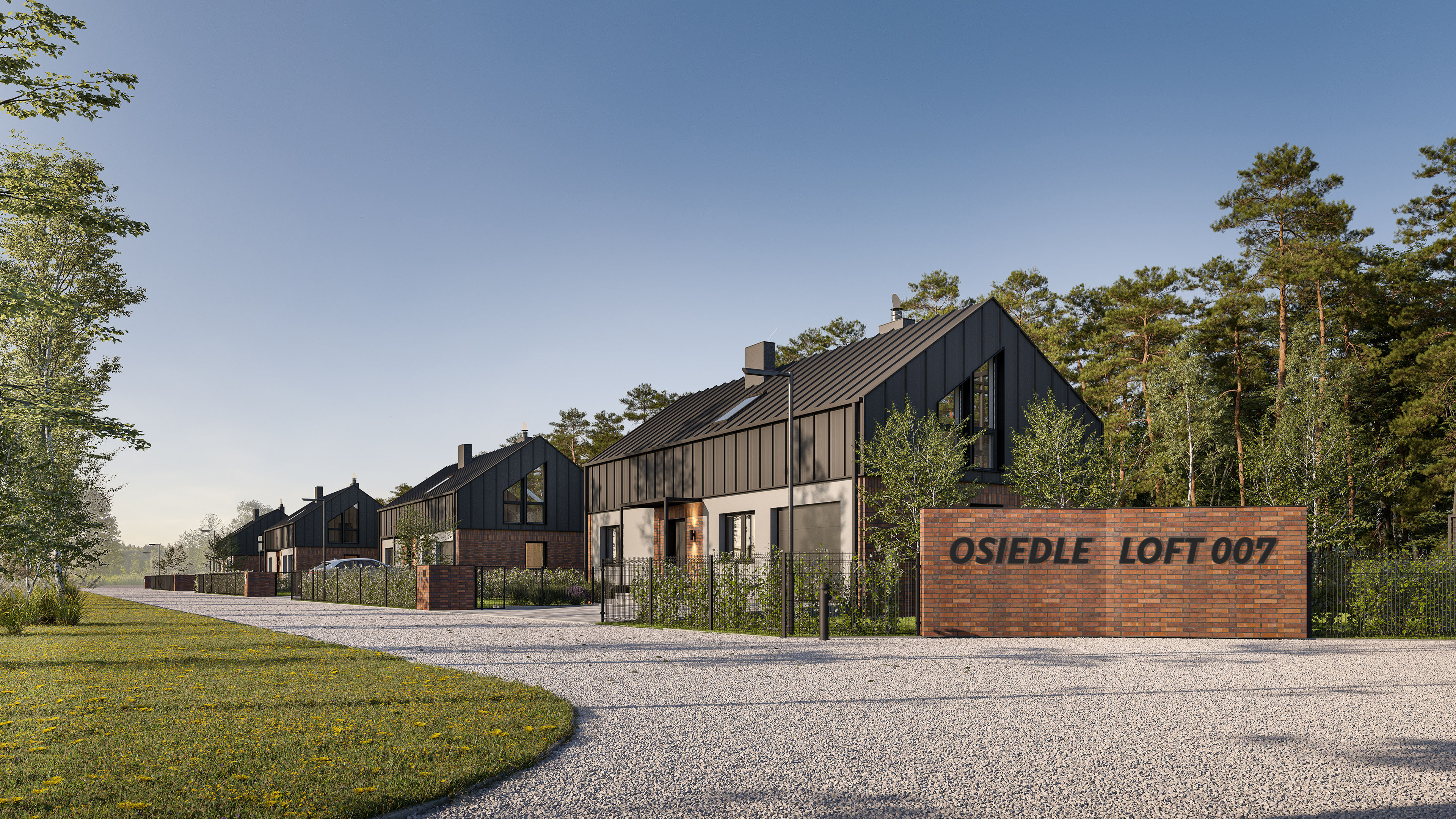 Loft 007 to kameralne osiedle domów typu stodoła, otulone planowanymi nasadzeniami leśnymi pomiędzy działkami, tworząc spokojną przestrzeń do życia. Nowoczesna architektura w naturalnym otoczeniu tworzy wyjątkową przestrzeń - spokojną, estetyczną i pełną zieleni. Domy z dużymi przeszkleniami o powierzchni 130m² i 166m² w stylu loftowym, ale budowane metodą tradycyjną - pustak ceramiczny i beton komórkowy H+H, ocieplone styropianem o grubości 30cm. Dach ocieplony wełną skalną o grubości 30cm. Elewacja składa się z blachy trapezowej, wyprawy tynkarskiej oraz płytki klinkierowej. Okna tarasowe HS trzyszybowe. Stan deweloperski.